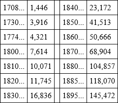 “A bunch of Grapes is Thurber’s sign,A shoe and boot is made on mine,My shop doth stand in Bowen’s Lane,And Jonathan Cady is my name.”Housekeepers in our day consider the servant-girl question a hard problem, but hear the complaint a century ago. There had been taken away “from the servant girls in this town, all inclination to do any kind of work, and left in lieu thereof, an impudent appearance, a strong and continued thirst for high wages, a gossiping disposition for every sort of amusement, a leering and hankering after persons of the other sex, a desire of finery and fashion, a never-ceasing trot after new places more advantageous for stealing, with a number of contingent accomplishments, that do not suit the wearers. Now if any person or persons will restore that degree of honesty and industry, which has been for some time missing,” then this rugged censor offers $500 reward.