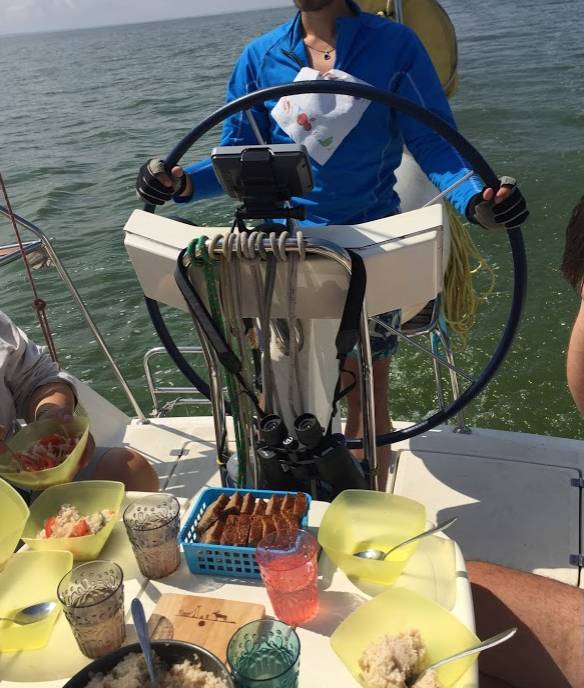 Где и как пообедаем – решили, поэтому я ушёл в кают-компанию и начал подготовку. Опытные яхтсмены обычно обходятся бутербродами в таких случаях. И безопасно (не обольёшься), и во рту окажется больше чем на палубе (из тарелки/ложки не вылетит). Но мы то были неопытными. Поэтому кроме бутербродов – каша, салат, горячий чай и «вкусняшки» (сладости к чаю). Пока я готовил (резал, грел, намазывал) процесс обучения не прекращался и на команду «Приготовится к повороту» отвечали не только шкотовые, но и я: «К повороту готов».
