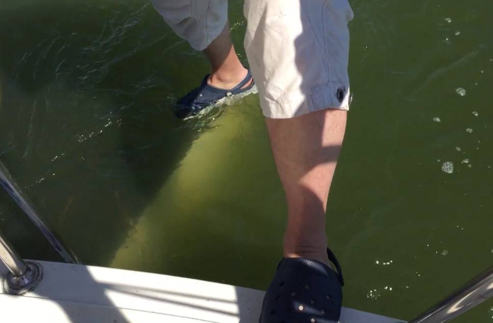 Во время швартовки, когда нужно было остановить движение яхты вперёд, мы давали такие обороты заднего хода, что неоднократно отстреливалось перо руля. У яхт со швертом, убирается не только киль, но и поднимается (отстреливается) перо руля. Вернуть его в рабочее положение с помощью отпорного крюка получалось не всегда. Как хорошо, что Лёша был экипирован кроксами типа сабо. Отстегнулся руль, вызвали Лёшу, подстраховали, когда он, стоя одной ногой на яхте, второй возвращал перо руля в рабочее положение. Хорошо, что вода была не холодной. Перо руля нужно было возвращать на место и во время наших тренировок в заливе, и при прохождении канала, когда его (перо руля) заворачивало рдестом. Поэтому на Лёшу, как-то сама собой легла ещё и эта очень нужная и важная обязанность – возвращать перо руля в рабочее положение.
