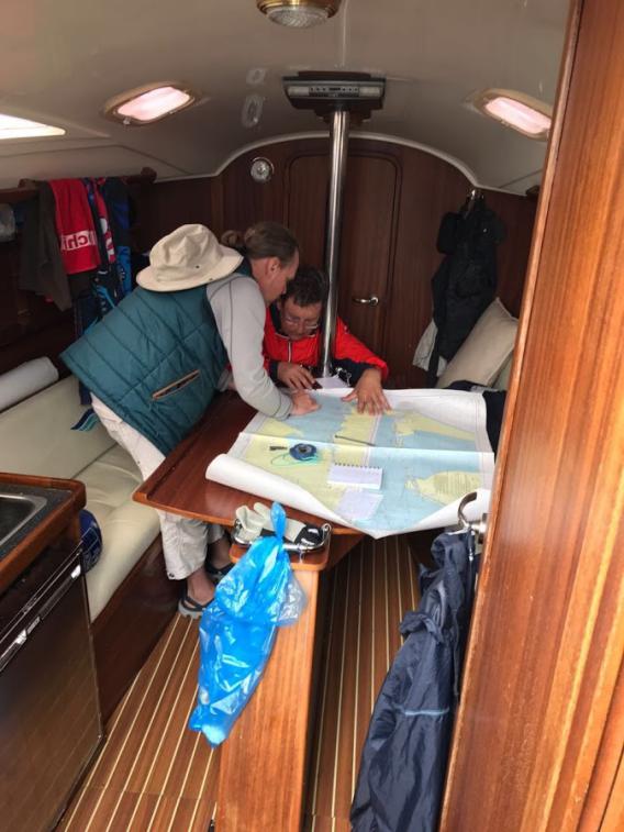 После завтрака опять вышли в Калининградский залив и опять чему-то научились. Уже абсолютно осмысленно обходили рыбацкие сети, определяли местоположение судна по двум пеленгам на один ориентир. Это когда знаешь курс и скорость. Берёшь на ориентир пеленг, потом, через какое-то время – ещё один. Зная скорость, рассчитываешь расстояние, соответствующее масштабу карты, от ориентира откладываешь два луча пеленга и, поставив линейку в соответствие с курсом движения яхты, двигаешь её (линейку) внутри лучей, до тех пор, пока пройденное расстояние не окажется между лучами.
