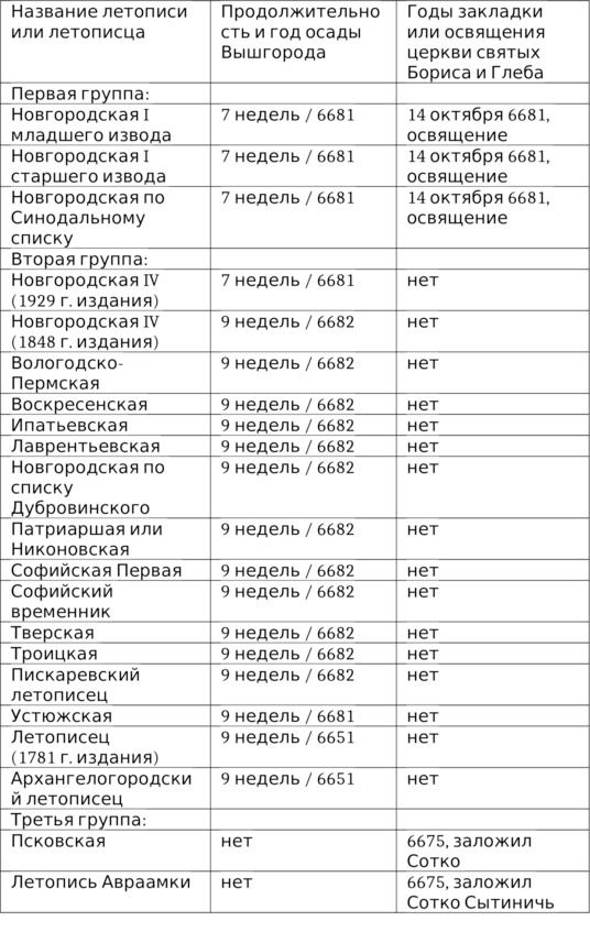 Таким образом, краткий анализ приведенных в таблице летописей и летописцев позволяет предположить, что автор CВ, в качестве одного из источников своего сочинения, мог использовать сообщения новгородских летописей об осаде Вышгорода и освящении в Новгородском кремле церкви святых Бориса и Глеба. Но какая именно редакция этих сообщений была им использована, однозначно утверждать нельзя. Впрочем, это и не так важно. Поскольку, судя по всему, СВ относится к числу тех сочинений, цель которых представляется настолько значимой, что ради ее достижения авторы готовы пожертвовать историчностью фактов.