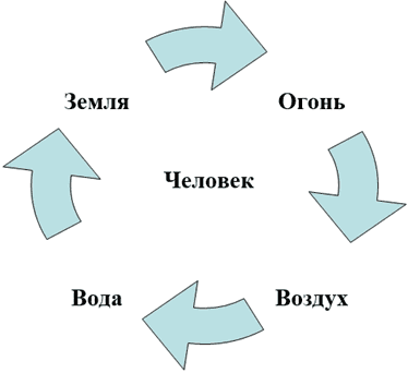 Считается, что каждая из стихий обладает определенными свойствами и они находятся в круговой иерархии. Так, вода сильнее земли, поскольку размывает ее, земля сильнее огня, поскольку засыпает и тушит его, огонь сильнее воздуха, так как пожирает его, а воздух сильнее воды, ибо ее высушивает. Человек же находится в центре стихий.