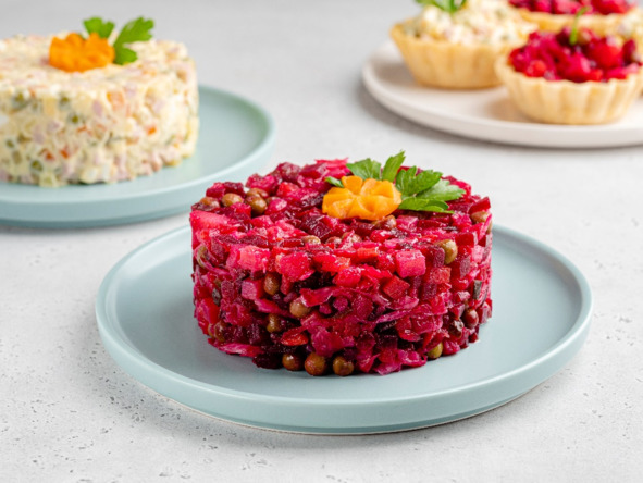 – В большой миске перемешать свеклу, картофель, лук, капусту и горошек.