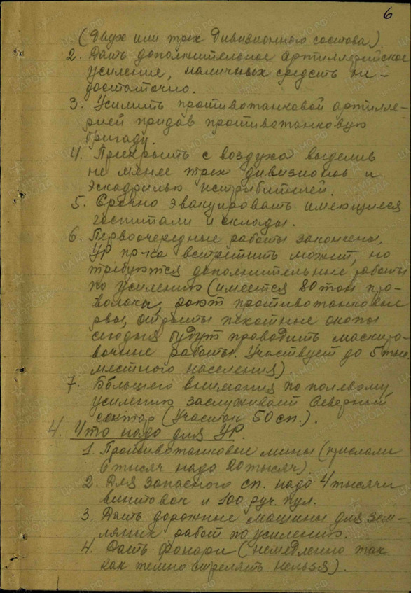 С рассветом 22 июня 1941 года регулярные войска германской армии атаковали наши пограничные часта на фронте от Балтийского до Чёрного моря и в течение первой половины дня сдерживались ими. Во второй половине дня германские войска встретились с передовыми частями полевых войск Красной Армии. После ожесточённых боев противник был отбит с большими потерями. Только в ГРОДНЕНСКОМ И КРИСТЫНОПОЛЬСКОМ направлениях противнику удалось достичь незначительных тактических успехов и занять местечки КАЛЬВАРИЯ, СТОЯНУВ и ЦЕХАНОВЕЦ (первые два в 15 км. и последнее в 10 км. от границы).