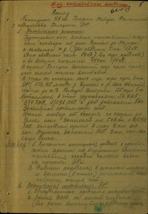 Из доклада командира 27 ск о подготовке Полоцкого УР.