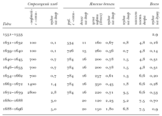 Уменьшив налоги с поместных земель, власти были вынуждены сократить и податное обложение монастырей. В «живущую четверть» на монастырских землях клали 6 крестьянских и 3 бобыльских двора. Поскольку в монастырской «сохе» было 600 четвертей, то налоги на монастырских землях были примерно в 2,3 выше, чем на поместных. Кроме того, во время войн монастырские и «черные» крестьяне были обязаны поставлять «даточных» (или «посошных») людей и платить «ратным людям на жалование»; в отдельные годы это резко увеличивало тяжесть повинностей. Хуже всего было положение крестьян на «черных» землях; «живущая четверть» оставалась здесь реальной четвертью пашни, и обложение «черных» крестьян, таким образом, сохранялось на прежнем высоком уровне. Земли центральных уездов были розданы в поместья, и основные массивы «черных» земель располагались на Севере и в Вятской области. На «черных» землях стрелецкий хлеб выплачивался деньгами, и до начала Смоленской войны вятские крестьяне платили примерно 260 дене;[28] по официальным расценкам это составляло около 20 пудов хлеба со двора или примерно 4 пуда с души. Это было в 10–20 раз больше, чем налоги поместных крестьян, но при этом нужно, конечно, учесть, что «черные» крестьяне не платили оброков помещикам.