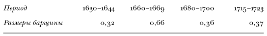 В целом сравнительно небольшие нормы барщины согласуются с экономической теорией, утверждающей, что уровень ренты в XVII веке должен быть ниже, чем в другие столетия. Однако на протяжении XVII века барщина не оставалась одинаковой, как показывает табл. 1.2, в 1660-х годах имело место значительное, более чем двойное увеличение барщинных норм. Ю. А. Тихонов объяснял это увеличение барщины закрепощением крестьянства по Уложению 1649 года.[52] Такое объяснение кажется вполне естественным, но почему же тогда впоследствии, в 1680-х годах, барщинные нормы уменьшились и практически вернулись к низкому уровню первой половины столетия? Что это? Следствие крестьянской войны, которая, в свою очередь, была ответом на рост барщины?