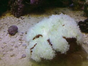 Но проблема была, и проблема серьезная: эта мелкая беленькая актиния все время садилась таким образом, что принудительно накормить ее возможности не было никакой (Вы никогда не пробовали накормить настенный коврик? Вон он, беленький-кудрявенький, из правого дальнего угла аквариума свисает!)…