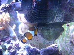 Бедная актиния так и сидела, в камушке – кормить ее было очень неудобно, раскрывалась она плоховато, да и клоуны всю ее затюкали (нет чтоб покушать принести – так сами выпихивали кусочки, которые она проглотить не успевала! ну так уж им нравилось в ней валяться – все время, а тут – нате вам! – еще и кормежка какая-то у их любимого диванчика…!)