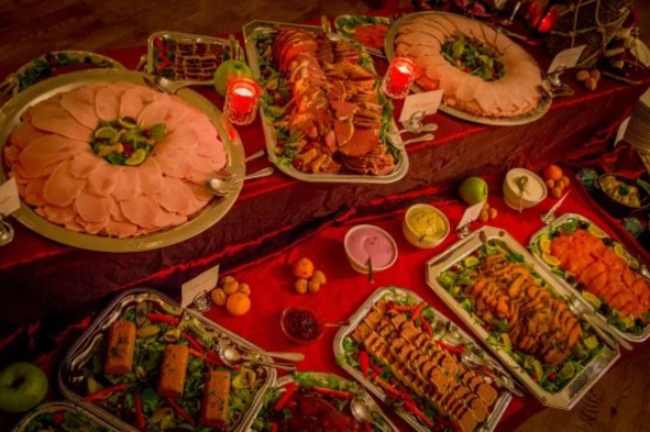Исландский праздничный ужин Йоулахлазборз представляет из себя ужин по принципу шведского стола с большим ассортиментом вкуснейшей исландской еды, состоящей из закусок, горячих мясных блюд и десертов.
