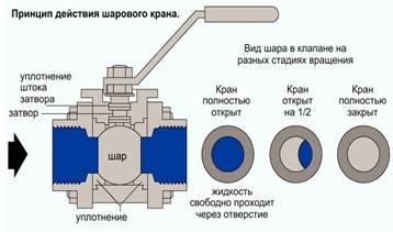 В открытом положении ось отверстия в затворе совпадает с осью трубопровода, а в закрытом оси, наоборот, перпендикулярны. Для полного открытия или перекрытия крана достаточно повернуть шар на 90°.
