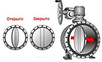 Дисковый поворотный затвор регулирует поток при помощи специального элемента – диска, закреплённого на валу, и поворачивающегося вокруг своей оси. Также как и шаровой кран, дисковый затвор способен осуществить перекрытие за достаточно короткое время, так как диск осуществляет такой же оборот на 90°, из-за чего этот затвор называют также четвертьоборотным [5]. Пример дискового затвора приведен на рис.1.20.