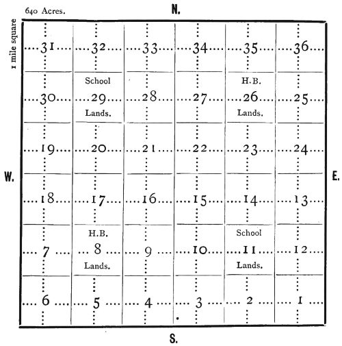 The above diagram shows the manner in which the country is surveyed. It represents a township—that is, a tract of land six miles square, containing 36 sections of one mile square each. These sections are subdivided into quarter sections of 160 acres each.