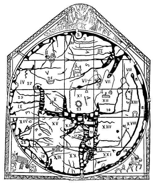 In the chapter on Great Explorers and The Foundation of Geography, in the body of the book, much might have been said about maps and map-making, for the Thirteenth Century was a great period in this matter. Lecoy de la Marche among his studies of the Thirteenth Century has included a volume of a collection of the maps of the Thirteenth Century. If the purpose had been to make this a work of erudition rather than of popular information, much might have been said of the cartography of the time even from this work alone (Receuil de Charles du XIII e Siècle, Paris, 1878). One of the great maps of the Thirteenth Century, that on the Cathedral wall of Hereford, deserves a place here. It was made just at the end of the Thirteenth Century. The idea of its maker was to convey as much information as possible about the earth, and not merely indicate its political divisions and the relative size and position of the different parts. It is to a certain extent at least a resume of history, of physical geography, and even of geographical biology and anthropology, for it has indications as to the dwelling-place of animals and curious types of men. It contains, besides, references to interesting objects of other kinds. Because of its interest I have reproduced the map itself, and the key to it with explanations published at Hereford.