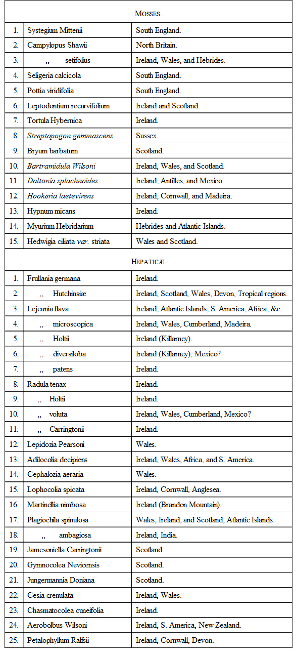 List of the Species of Mosses and Hepaticæ which are peculiar to the British Isles (or not found in Europe).