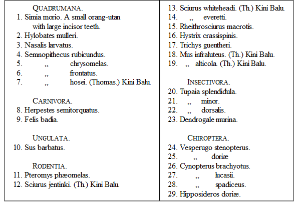 Zoological Features of BorneoMammalia.—Nearly a hundred and forty species of mammalia have been discovered in Borneo, and of these more than three-fourths are identical with those of the surrounding countries, and more than one half with those of the continent. Among these are two lemurs, nine civets, five cats, five deer, the tapir, the elephant, the rhinoceros, and many squirrels, an assemblage which could certainly only have reached the country by land. The following species of mammalia are supposed to be peculiar to Borneo:—