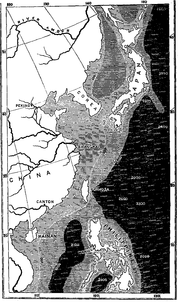 JapanThe Japanese Islands occupy a very similar position on the eastern shore of the great Euro-Asiatic continent to that of the British Islands on the western, except that they are about sixteen degrees further south, and having a greater extension in latitude enjoy a more varied as well as a more temperate climate. Their outline is also much more irregular and their mountains loftier, the volcanic peak of Fusiyama being 14,177 feet high; while their geological structure is very complex, their soil extremely fertile, and their vegetation in the highest degree varied and beautiful. Like our own islands, too, they are connected with the continent by a marine bank less than a hundred fathoms below the surface—at all events towards the north and south; but in the intervening space the Sea of Japan opens out to a width of six hundred miles, and in its central portion is very deep, and this may be an indication that the connection between the islands and the continent is of rather ancient date. At the Straits of Corea the distance from the main land is about 120 miles, while at the northern extremity of Yesso it is about 200. The island of Saghalien, however, separated from Yesso by a strait only twenty-five miles wide, forms a connection with Amoorland in about 52° N. Lat. A southern warm current flowing a little to the eastward of the islands, ameliorates their climate much in the same way as the Gulf Stream does ours, and added to their insular position enables them to support a more tropical vegetation and more varied forms of life than are found at corresponding latitudes in China.