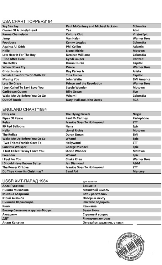 В Америке в это время все еще невероятно востребован патриотический хит от Брюса Спрингстина – «Born In The USA», успешен «Part Time Lover» великолепного Стиви Уандера. Не отстает и Мадонна с песней «Material Girl», таким образом получившая свое второе прозвище, Уитни Хьюстон демонстрирует «Saving All My Love For You». Популярен и канадец Брайан Адамс c очередным хитом «Summer of 69».