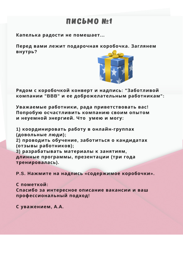 Работа продолжается – написать сопроводительное письмо. Еще одна проблема появилась. С ней справится наш кандидат. Однажды получилось составить интересное (даже смешное) письмо для работодателя (менеджера по кадрам). Вот его текст.