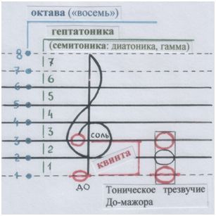 Вертикаль ключа, поднимаясь снизу вверх (по правилу обертонов, в соответствии с природой звука), охватывает и гептатонику ( она же – и диатоника, и гамма), и охватывает октаву (расстояние-интервал от примы – тоники – до её повторения вверху, то есть до октавного звука).