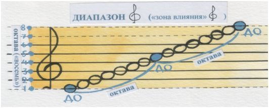 Вертикаль ключа показывает нам октаву, а диагональ звуков – две октавы, укладывающиеся в октаву ключа.