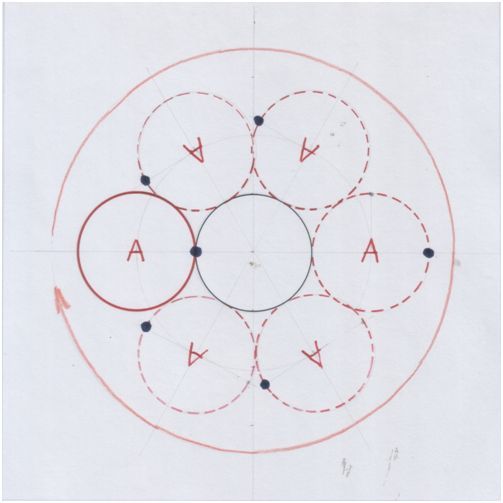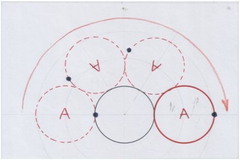 Обе начальные окружности (чёрная и круга А) совершенно одинаковы, с одинаковым количеством точек, из которых состоят. При движении круга А все точки его окружности должны были совпасть с точками чёрной окружности «точка в точку», – допустим, на каждый градус поворота – по точке. Но градусов поворота оказалось в два раза больше, – как будто у окружности круга А и точек в два раза больше.