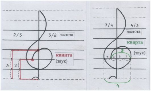 Сама вертикаль поднимается от нашей «нулевой точки отсчёта» – ДО, которую мы называем «первой» (примой), дорастает до октавного повторения примы (по количеству линеек!) и делает возвратную петлю в виде волны и спирали, которая завершается точкой, обозначающей звук (звук!) квинты.
