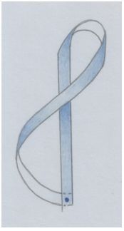Если мы её склеим в обозначенной точке, у нас получится Петля Мёбиуса ( она же – Лента Мёбиуса). Она будет обладать свойствами Ленты Мёбиуса, даже если мы склеим концы нашей ленты под прямым углом.