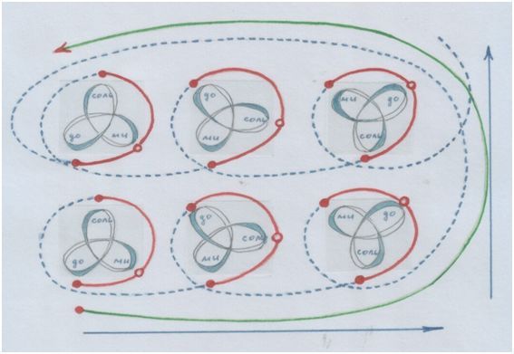 Здесь мы увидим и вертикаль восхождения; и волну, и спираль, – которые «перетекают» друг в друга, преобразуются друг в друга и, в конце концов, утверждают квинту СОЛЬ в системе координат от нулевой точки ДО.