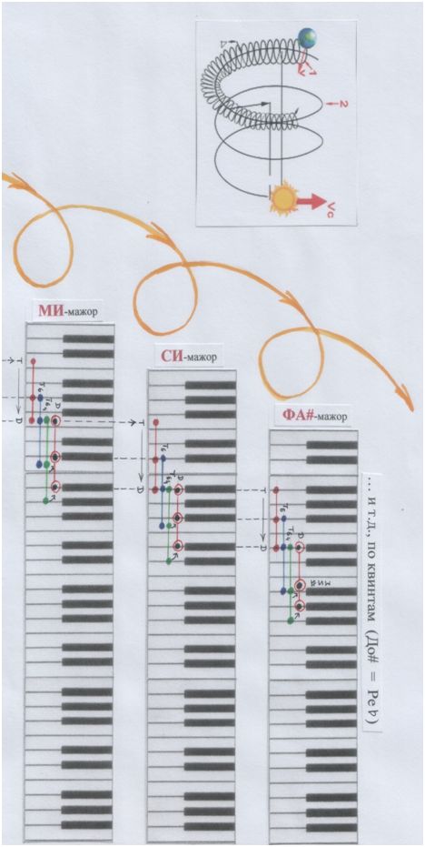 И в то же время, всё разнообразие музыки (как и неповторимых «музык» наших человечьих жизней) держится и связывается Законом квинт – квинт, движущихся вслед за Солнцем (вместе с нашей планетой Землёй) ввысь, «по Солнцу», «по свету».