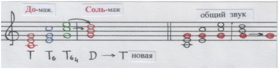 Тоническое трезвучие, обернувшись квартсекстаккордом, оказывается на доминантном звуке (на квинте). И тут срабатывает гравитация, притяжение, «магнитное поле» доминанты. И эта доминанта перетягивает верхнюю терцию тонического квартсекстаккорда к себе поближе и превращается в новое трезвучие, с новой тоникой.