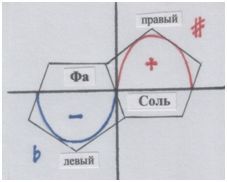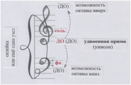 Левый узел – ключ «ФА» – показывает квинту влево (на клавиатуре); правый узел – ключ «СОЛЬ» – показывает квинту вправо (тоже на клавиатуре). Место их встречи, или их общее начало, – ДО.