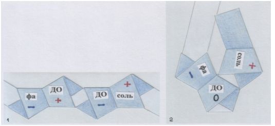 Конечно, мы подразумеваем, что где-то между ними «нулевая точка отсчёта» ДО. Но ведь в музыкальной системе, которая измеряет пространство-время не точками, а квинтами (самых разных масштабов), ДО измеряется тою же мерой. ДО – квинта вверх по отношению к ФА и квинта вниз по отношению к СОЛЬ. Относительность в действии! У ДО двойная роль: + и –, бемоль-диез в наложении друг на друга. В результате – нейтралитет. Вот смысл её «нуля». Если промоделировать это квинтами-узлами, они неизбежно выведут нас из прямоугольной системы координат, существующей на плоскости, в пространство. Вот как узлы покажут смысл ДО: