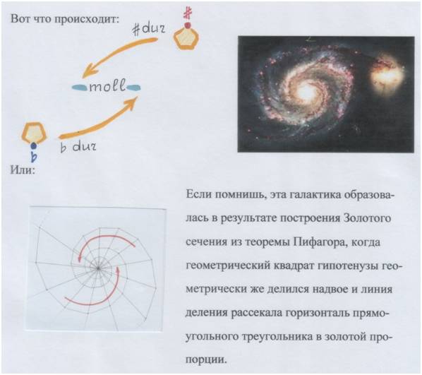 В рисунке галактики ты видишь м о д у л я ц и и (изменения) треугольника. Они возможны благодаря Золотому сечению. Благодаря с а м о п о д о б и ю: все они п о д о б н ы друг другу. Это как будто один и тот же треугольник («сам») то увеличивается, то уменьшается, то возрастает, то убывает – изменяется (он вроде тот же, да не тот). Изменяется с одним и тем же коэффициентом пропорциональности.