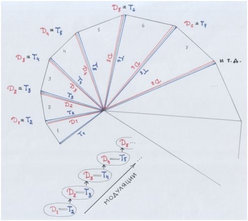 Тональности изменяются, увеличивая или уменьшая высоту (высотное положение) своего главного, опорного звука – тоники. Они изменяют своё высотное положение в музыкальном строе, то «диезно» шагая вверх по квинтам, то «бемольно» спускаясь вниз по квинтам. Тоники шагают по квинтам вверх или вниз. Тональности шагают своими тониками по квинтам.