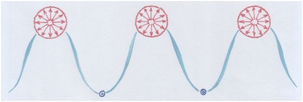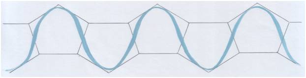 Левые узлы (лента вяжется в узел зеркально: справа налево) – квинты, идущие вниз – бемольные тональности. Пятиугольники вершинами вниз означают явление понижения, «бемольность». (На модели – синие вершины.)