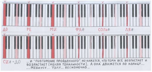 Этот звукоряд (упорядоченный ряд звуков) тоже гуляет по кольцу-бесконечности (Мёбиусу, узлу).