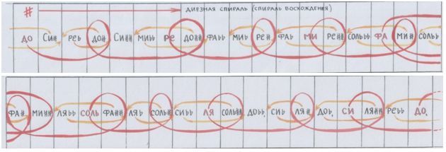…Кажется, вот теперь вырисовывается действительно п о с л е д о в а т е л ь н о с т ь. И она – не прямолинейна. Пружина! Спираль. Пока что – спираль восхождения. На этот взлёт-восхождение намекают диезы.