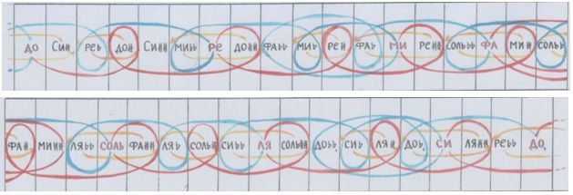 Вот эти противодвижения и побуждают звуки к колебанию ( на ленте – это показано «вращающимися» звуками). Когда-нибудь мы непременно услышим, как каждый звук «растекается», словно круги на воде, волнами. И это показывают микроинтервалы – те самые к о м м ы, в окружении которых каждый основной звук и оказывается.