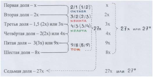 «Доля» у нас неизвестное – икс х. Х может быть и звуковым интервалом, как прежде, и угловой мерой – если, как Пифагор, мы захотим у в и д е т ь звук как геометрию. Эти угловые меры мы можем обозначить привычными нам градусами вместо греческих «долей».