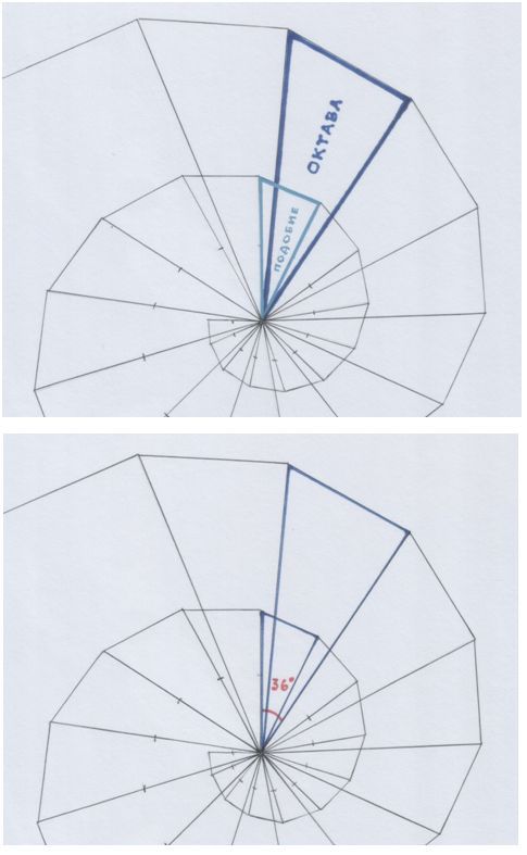 Октава и её подобие, образующие «золотой» угол – 36º: как 36 звуков в пифагоровой октаве.