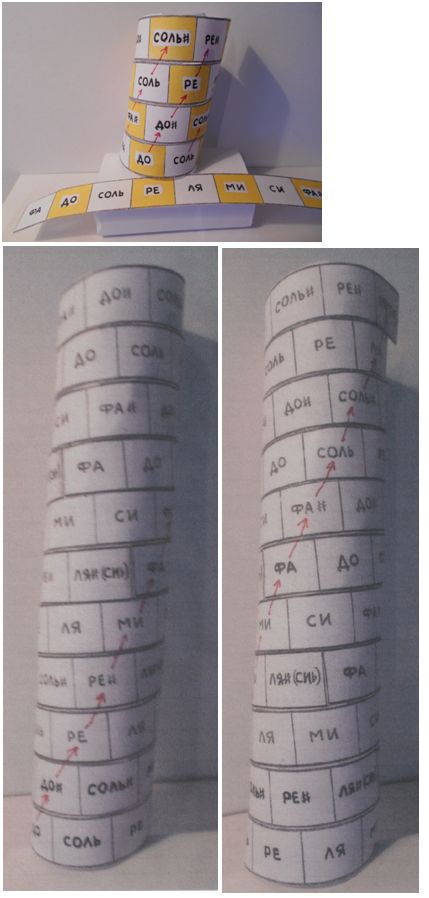 Они окажутся рядом, если мы свернём эту ленту спиралью и учтём, что не закрашенные карандашом ноты – это подобия тех вертикалей ступеней, которые мы получали в строе Пифагора: то есть мы будем шагать через одну квинту, и постепенно у нас выстроится весь ХРОМАТИЧЕСКИЙ китайский звукоряд.