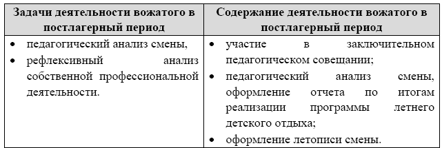 Этот период наступает после окончания смены, когда дети возвращаются домой. Это этап рефлексии и детей, и вожатого. На данном этапе происходит анализ деятельности в лагере. Ребенок формирует отношение к жизни в лагере и желание или нежелание провести следующие летние каникулы в детском оздоровительном лагере.