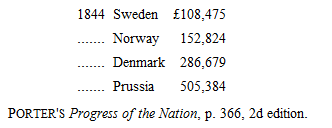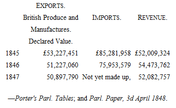 The second is, that the tonnage with countries near Great Britain, such as France, Belgium, and Holland, includes steam vessels carrying passengers, and their repeated voyages. In this way a boat, measuring 148 tons, and carrying passengers chiefly, comes to figure in the returns for 24,000 tons! It is evident that this important circumstance deprives the returns of such near states of all value in the estimate of the comparative amount of tonnage engaged in the trade with different countries. That with France will appear greatest in spring 1848, in consequence of the number of large vessels then employed in bringing back English residents expelled by, or terrified at, the Revolution – though that circumstance was putting a stop to nearly all the commercial intercourse between the two countries. As steam navigation has so immensely increased since 1834, when the changes in the measurement was introduced – and Great Britain, from its store of coal and iron, enjoys more of that traffic than all Europe put together – this is another circumstance which militates against the returns as exhibiting a fair view of our trade, compared with that of foreign nations, especially with near countries, and fully justifies Mr Porter's admission, when examined before the Lords' committee, that "considerable fallacy is to be found in the returns." Unfortunately for the Free-traders, however, who had the preparation of them in their hands, these fallacies all point one way – viz. to augment the apparent advantages of free trade in shipping.