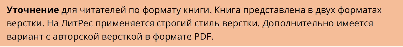 Материал книги полностью отформатирован (сверстан) под чтение с электронных устройств. Другими словами, внешний вид книги не предполагает типографскую печать. Среди всех электронных устройств, преимущество отдается планшетам с диагональю 9-10 дюймов. Одна версия книги сверстана под электронные читалки и распространяется через магазин ЛитРес, сервис Самоиздат, https://selfpub.ru/. Другая версия книги подготовлена с расширенной версткой в формате PDF и распространяется через журнал самоВод, https://samovod.ru/content/articles/57725/. В PDF формате предполагается, что планшет используется в ориентации «портрет». Следствием является выбор основного шрифта Open Sans из списка «электронных» шрифтов, а размер шрифта в 13 пунктов. На экранах с другой диагональю рекомендуется выбрать комфортный для чтения масштаб.