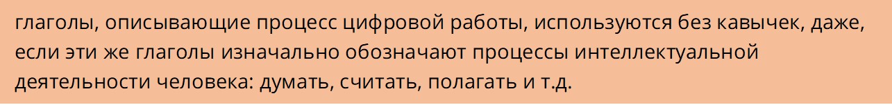 Точнее, у нас есть глаголы арифметического происхождения, «калькулятор подсчитал», «машина рассчитала», «машина оценила». Действительно, все современные машины, ничего, кроме арифметических действий, делать не умеют. Другое дело, что машина может производить вычисления быстро и в неимоверных количествах. По мере роста числа вычислений результат этих вычислений может напоминать интеллектуальный анализ, сделанный человеком. Например, машина уже сейчас может выдать ответ на вопрос «К чему ближе язык произведений Тургенева, к языку произведений Толстого или произведений Достоевского?». Если бы этот же вопрос мы задали литературоведу, то его ответ мы могли бы изложить так: «Эксперт думает (полагает), что язык Тургенева ближе к языку Толстого, чем к языку Достоевского». Если мы описываем кратко ответ машины на тот же вопрос, то на текущий момент мы обязаны брать аналогичные глаголы в кавычки, подразумевая, что на самом деле машина не «думает», а выполняет арифметические действия.