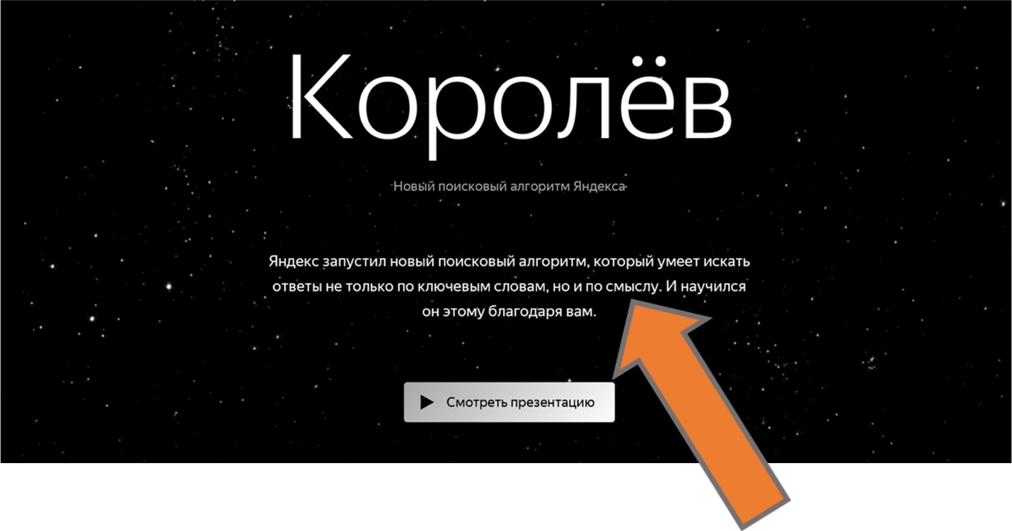 Давайте обратимся в одному из первоисточников, к технологиям компании Яндекс. Яндекс непрерывно совершенствует свою технологию, а каждую новой версии дает имя одного из городов России, как бы «играет в города». Год назад, 22 августа 2017 года компания представила новую версию поискового алгоритма «Королев», https://yandex.ru/korolev/. Вот заставка к презентации.