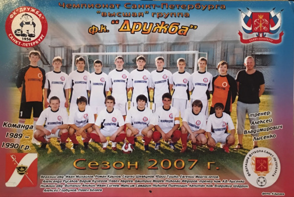 В ФК Дружба я приходил из Московской Заставы, когда сам из нее уходил. С Дружбой связано много воспоминаний. Правда, когда Михаил Юрьевич Труд тренировал 1989 года рождения, у меня практически не осталось никаких моментов из его тренировок. Помню только ребят, с которыми играли в футбол – Виталий Аникин, Тимур Бошайкин, Сергей Шевкунов и другие. На смену Михаилу Юрьевичу Труд пришел тренер Михаил Юрьевич Сергеев. С его отцом я уже учился игре. Теперь настало время учиться у его сына. В целом мне нравилось тренироваться с ним. Разнообразные тренировки, хорошая интенсивность. Помню, как он всегда во время вечерних тренировок пил йогурт и кушал булочки. Видимо так много работал, что не успевал перекусить. Когда мы играли совмещенными группами 1989 и 1988 года, наши результаты были не такими яркими. Но клубом мы смогли выйти в Высшую Лигу Санкт-Петербурга. А вот в следующем сезоне с 1990 и 1989 годами мы смогли занять 5 место и остаться с клубом в Вышке. В 1990 году были собраны лучшие ребята из города: Шадрин Владимир – капитан, пробовал свои силы в ФК Политех, после окончания школы Дружба, Самарин Максим – мог бы быть вторым Аршавиным, Роман Разумилов – одинаково играл двумя ногами (первый раз такого футболиста увидел), Павел Авдеев – очень сильный защитник, с ним одно удовольствие было играть, он снабжал мячами постоянно. С ними мы выиграли зимой первенство города по мини-футболу среди первых юношей. Кстати, обыграли сильнейшую команду Локомотив. Обыграли на тот момент практически сборную города и Ленинградской области по мини-футболу «Славатор». Почему-то ее собрали из игроков разных команд города и защищали г. Лодейное Поле. Но мы обыграли всех и стали чемпионами. В той команде мне очень нравилось играть. Получал огромное удовольствие от игр, а еще получалось показывать результат.