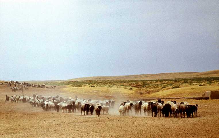 Остановка Кырк-Кудук, что по-казахски означает «сорок колодцев». Да, теперь по-казахски, потому что мы въехали на территорию Казахстана. Жара, однако, тут ничуть не меньшая, чем в Узбекистане, дует такой же сухой и горячий ветер. Представьте себе совершенно ровную на много километров поверхность земли, вернее – высохшей глины, покрытую очень низкой и жесткой зеленовато-серой растительностью. Этакий шершавый, а кое-где колючий бескрайний половик – грубая и короткая шерсть Земли, исполосованная желтыми линиями дорог. Это сухая степь. Чуль. Ни с того ни с сего посреди нее – толстостенная то ли глиняная, то ли цементная коробка с выступом. Над выступом торчит обыкновенный бензомотор со шкивом и рукояткой. От мотора вниз, в бетонную трубу, спускаются два матерчатых ремня. Это и есть Кырк-Кудук, спасение овцеводов. Мотор заправляется бензином, включается зажигание, ремни, а вернее – один кольцевой бесконечный ремень, начинает двигаться, нижняя его часть, достигающая слоя подпочвенных вод, намокает и ползет вверх, где специальная скоба выжимает из нее воду, стекающую в цементный бассейн колодца по желобу. Люди пьют из верхней части бассейна, овцы, лошади и верблюды – из нижней. Вода горьковато-солоноватая и, конечно, теплая. Но пить можно.