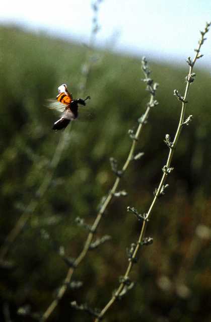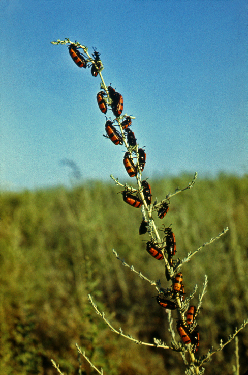 Но еще интереснее картина бывала утром. Одно время я взял привычку бегать по утрам – вместо гимнастики – перед умыванием и завтраком: направлялся от палатки в тугай и бегал по знакомым дорожкам (в самых обыкновенных спортивных тапочках, между прочим), перепрыгивая через надвигающиеся на тропинку кусты солодки, ныряя под ветвями тамарикса и туранги. И, как правило, в одном и том же месте встречал целую колонию – наверное, несколько тысяч – нарывников-калида, облепивших кустики солодки и стебли злаков. Так они ночевали. Чем им понравилось это место, я не знаю, их любимых цветов там не было, и вообще, как только лучи солнца согревали их немного, они один за другим сначала шевелили лапками, потом проползали чуть-чуть для разминки и вдруг резко вскидывали переднюю часть тела, раскрывали, разламывали свои надкрылья и, как какие-нибудь черно-красные демоны, со страшным гудением взлетали. Это было необычайно впечатляющее зрелище – увидев такое в первый раз, я опрометью побежал к палатке, схватил аппарат, вернулся и целый час пытался запечатлеть нарывника в момент взлета. Это оказалось очень трудным – взлетали они всегда неожиданно, нелегко было угадать, чья именно очередь, и, бывало, я выбирал одного; согнувшись в три погибели и затаив дыхание, держал его в фокусе, до рези в глазах вглядываясь в видоискатель, а потом в самый решающий момент или что-нибудь отвлекало меня – например, один из сотен соседних жуков в одиночестве или в компании с другом внезапно забирался под мою спортивную форму и бойко полз дальше и дальше, – или я сам терял терпение и, решив, что этот соня еще нескоро оставит свой насест, настраивался на соседнего, который, кажется, уже разминался; но в тот самый момент соня внезапно взлетал, я от досады сбивался с фокуса, и тотчас, разумеется, взлетал соседний. В результате я опоздал на завтрак, а взлет нарывника так и не снял. Днем я обычно проходил мимо этого места, но не видел ни одного жука.